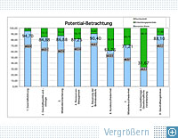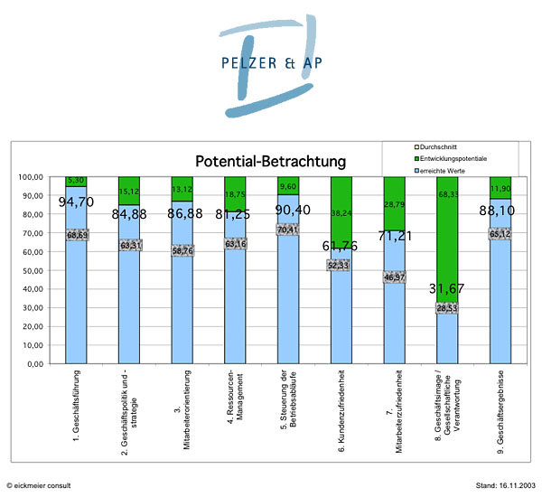 Für jedes beteiligte Unternehmen wurde zu Beginn und am Ende des Projektes eine individuelle Potentialauswertung erstellt. Anhand der grünen Balken ist festzustellen, in welchen Bereichen das Qualitätsniveau hoch ist und in welchen Bereichen der Change-Bedarf besonders groß ist.